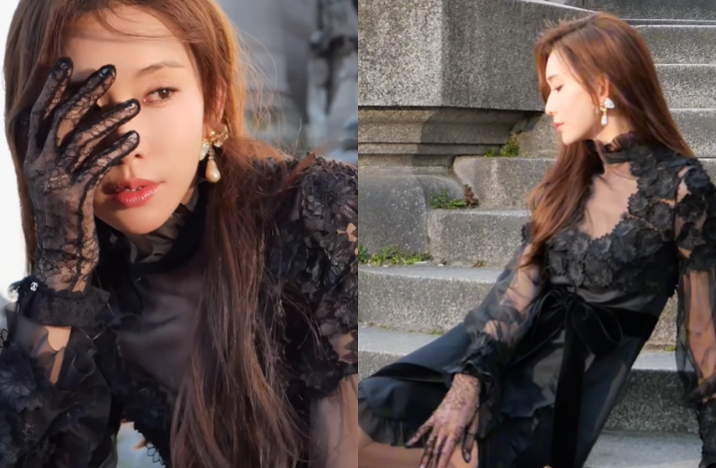 林志玲先前到巴黎觀賞VALENTINO的時裝秀,同時她也在會場周邊拍攝一系列美照,只見她身穿全黑高衩洋裝,胸前的薄紗設計使深長事業線若隱若現,下半身搭配了透膚長襪、高跟鞋,也大方展現膝蓋延伸至大腿根部的雪白肌膚,整體洋裝的修身剪裁,更凸顯她極度自律的窈窕身材。