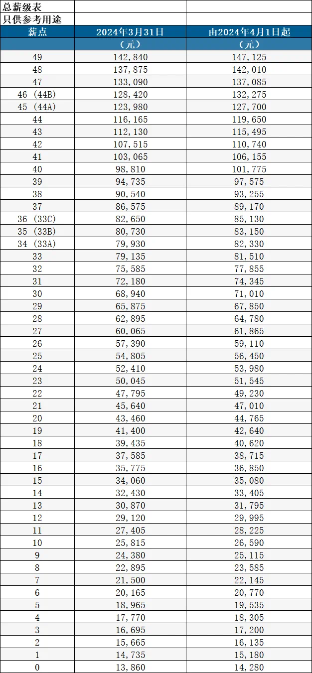 例如,屬于基層的打字員享有8個增薪點,每個增薪點大約有幾千元的差距,而最高級的公務員即首長級第8級的常任秘書長,雖然首長級薪級表只有1個增薪點,但兩個薪點相距約9500多元。紀律部隊也是一樣的,警員薪級表的薪級介乎第4至17點之間,即享有13個增薪點,新入職的警員月薪為28940元,而其職級頂薪點的月入則為42390元,每個薪級點大約相距1000多元。