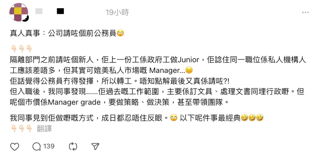一位自稱在市場營銷領域工作的香港網民表示,自己公司另一個部門聘請了一位前公務員。據這位前公務員所說,他之前在政府部門擔任較為初級的職位,因為覺得在政府內部沒有發展空間,所以決定離職。然而,這位前公務員以為私人機構同等職位的人工和政府相近,但事實上,他過去的薪資已經可以媲美經理級別,按照市場價格,他理應承擔起制定策略、做出決策甚至帶領團隊的責任。
