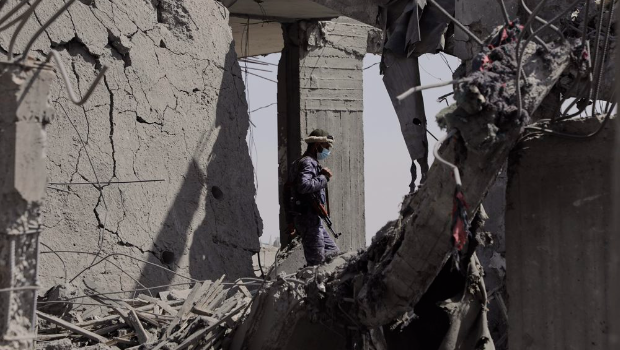 ▲一名胡塞武裝的安全人員正在也門首都沙那(Sanaa)檢查一棟疑似遭美軍空襲摧毀的建筑殘骸。(圖/美聯社)