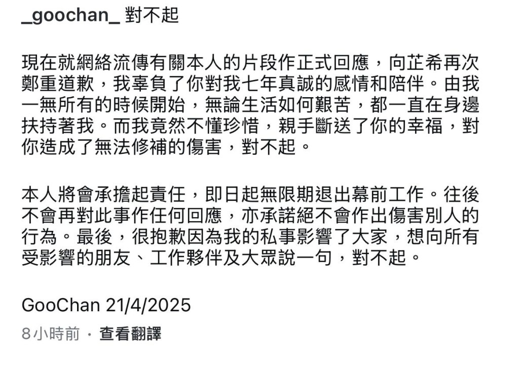 而陳澤鴻21日凌晨在社群發聲回應,首先再次向前女友芷希道歉,兩人從事業初期就一同打拚,互相扶持,但“我辜負了妳對我七年真誠的感情和陪伴,親手斷送了妳的幸福,對妳造成了無法修補的傷害,對不起”。接著,陳澤鴻宣布無限期退出幕前工作,未來不會再為此出面說明,也不會再做出傷害別人的行為,“很抱歉因為我的私事影響了大家,想向所有受影響的朋友、工作伙伴及大眾說一句,對不起”。