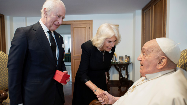 ▲英王查理斯三世夫婦4月9日才剛到訪梵蒂岡,與教宗方濟各會晤。 美聯社