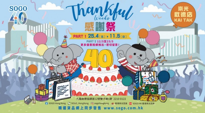 為慶祝崇光40周年,銅鑼灣店與啟德店舉行半年一度“崇光感謝祭 SOGO Thankful Weeks”,首階段將于4月25日至5月11日推出,優惠涵蓋各式特選商品。崇光實體店感謝祭之先,其網店由即日起至4月24日舉行獨家預售,各款名牌手袋、化妝護膚品、廚具、行李箱低至14折發售,包括深受女士們歡迎的Kate Spade、Marc Jacobs手袋,以及LANCOME、KIEHL'S、ORIGINS等護膚產品。