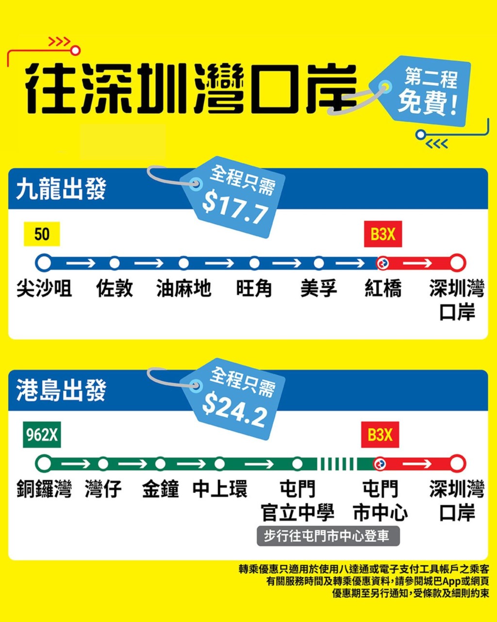 至于港島居民,現只需首程乘搭由銅鑼灣摩頓臺至屯門龍門居的962X線巴士,于屯門官立中學步行往屯門市中心轉乘B3X往深圳灣口岸,同樣可即享深圳灣口岸“第二程免費”優惠,全程車費只需HK$24.2,即省HK$16.5。