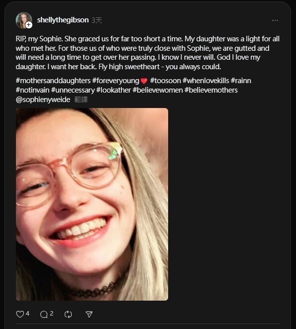 ▲Sophie Nyweide被公布離世消息。