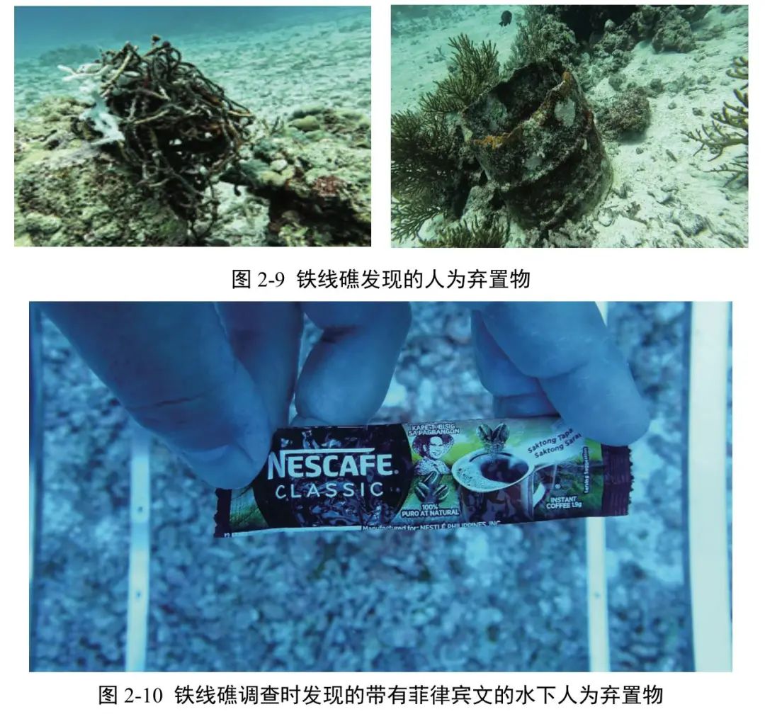 三是鐵線礁海域發現有菲律賓等外方漁船未經許可非法開展捕撈作業,菲律賓在我中業島上非法開展施工建設,相關調查站位發現有漁線、漁網、塑料包裝、鐵筒、玻璃瓶等人為棄置物,部分帶有菲律賓文、部分帶有產自菲律賓標識。