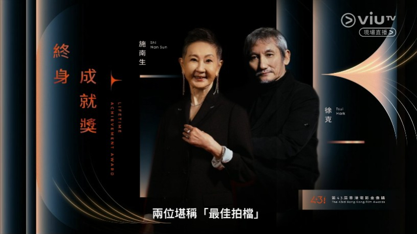 20:59 20:59 施南生及徐克獲頒終身成就獎,林青霞現身頒發獎項。 林青霞在臺上憶述當年來港拍戲,感激施南生及徐克賞識及給予機會,令她在香港打開知名度,笑言“能認識他們也算是我的終身成就”。
