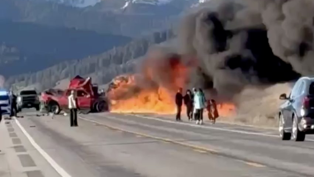 ▲黃石國家公園附近發生一起猛烈車禍,一輛載有游客的旅游廂型車與一輛皮卡貨車相撞后起火,造成至少7人死亡、8人受傷。X@tparon