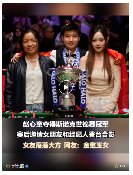 頒獎禮上,趙心童邀請女朋友和經紀人一起登臺合影。