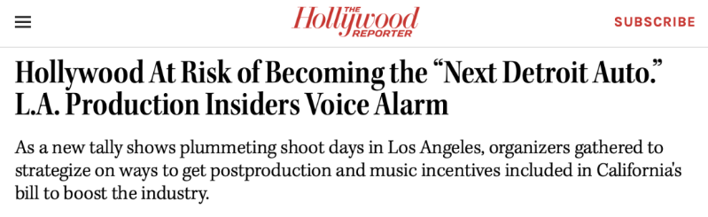 《好萊塢報道者》發表題為《好萊塢或成為下一個底特律》的文章,指出好萊塢最后可能只剩一具空殼。