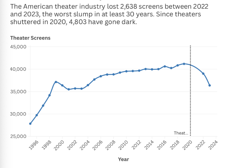 2022年至2023年間,美國影院損失了2638塊銀幕,這個趨勢還在延續。