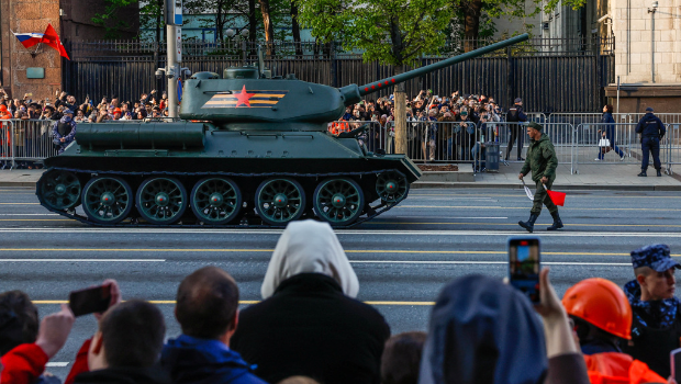 ▲俄羅斯莫斯科街頭4日出現蘇聯時期T-34坦克,這是軍方投入二戰勝利日游行展示的二戰武器之一。(路透)