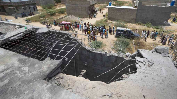 ▲2025年5月8日(星期四),巴基斯坦卡拉奇,一架疑似印度無人機遭巴基斯坦防空系統擊落后,居民聚集在封鎖線后方,圍觀疑似遭印度無人機攻擊而受損的住宅屋頂,屋頂上可見一個大洞。(圖/美聯社)