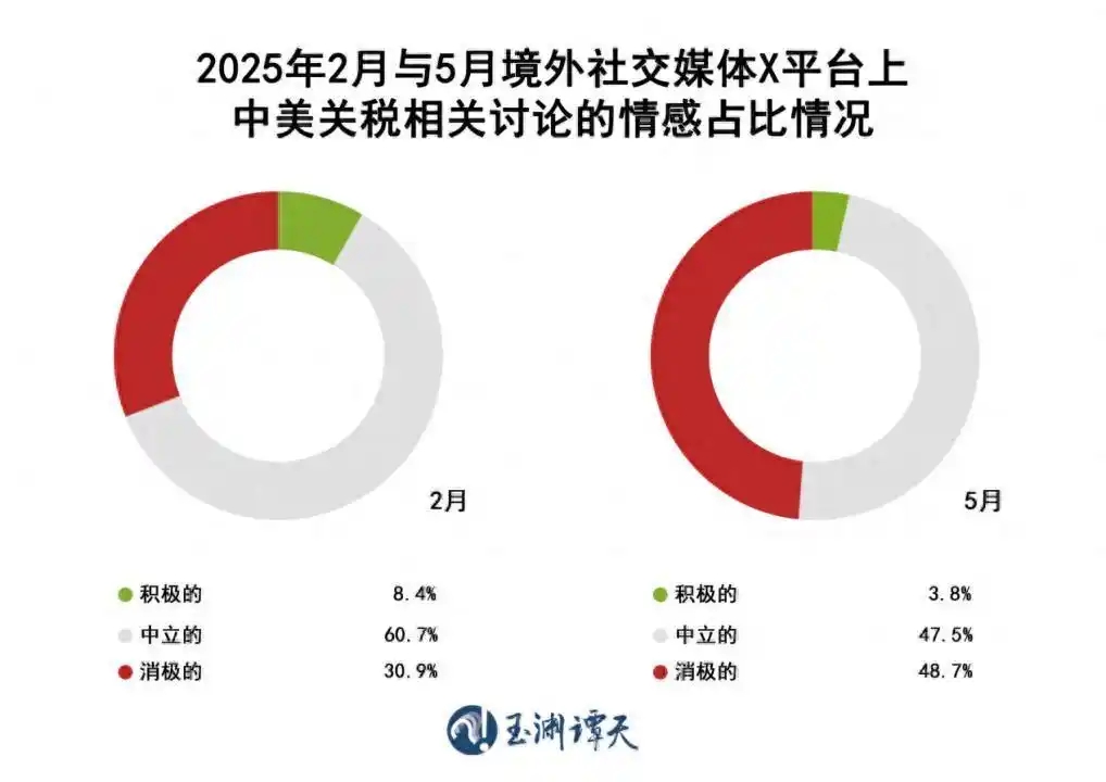 據美國哥倫比亞廣播公司報道,4月第二周以來,美國電商亞馬遜平臺上的賣家已經上調了近1000種商品的價格,平均漲價幅度接近30%,美國消費者逐漸感受到美國政府濫施關稅帶來的影響。而在特朗普一次又一次對華加征關稅的過程中,境外社交媒體X平臺上中美關稅相關討論的負面情感占比,已經從2月的30.8%上升到5月的48.7%。