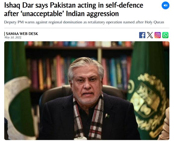 首頁>國際>要聞 巴基斯坦副總理:對印軍事行動是自衛,適當時候會結束 發布時間:2025-05-10 10:37 據巴基斯坦SAMAA電視臺報道,當地時間10日,巴基斯坦副總理兼外長達爾表示,巴基斯坦對印度采取的軍事行動是“有節制的自衛行為”,是對巴基斯坦主權屢次受到侵犯的回應。▲巴基斯坦SAMAA電視臺報道截圖達爾在一份聲明中表示,此次報復性行動不僅在軍事上正當,而且在道義上也合情合理,并強調“我們保持了克制和決心?!?/p>達爾透露,“此次行動將在適當的時候結束”,但沒有透露具體細節。達爾還重申,巴基斯坦的領土完整不容談判。印度方面尚未對此予以回應。來源:中國新聞網 相關閱讀 姜再冬大使會見巴基斯坦總理夏巴茲 要聞2025-05-02 巴印交火,中方發聲:希望雙方保持克制,推動事態降溫 要聞2025-04-28 熱門文章 習近平出席俄羅斯紅場閱兵式,普京:贊賞中國反法西斯貢獻 關稅戰|中美高層瑞士會談前夕,特朗普:對華關稅80%合適 F-22都無計的“陣風”為何喪命于殲-10C?專家:中國空戰體系小試牛刀而已 遭執政民進黨控“組織性犯罪”,臺灣國民黨恐被解散 中國儀仗隊雄姿英發,在俄勝利日閱兵亮相 印巴沖突 | 印方:一名高級官員在巴襲擊中死亡 妙瓦底至少8園區用“星鏈”上網,馬斯克被質疑為電詐幫兇 美國為何在此時撇開以色列宣布與也門胡塞武裝?;?? 局勢緊張!巴、印敵對行動仍在持續,CNN曝“沖突升級關鍵” 金秀賢經理人再度發聲明反擊派出2殺手滅證,列5點斥屬無稽之談決將追加提告 專題 更多 > 中芯國際上半年營收預計超22億美元,四季度將試產7nm工藝 太興盈喜料多賺逾3倍,指將堅守審慎理財政策 中國移動半年多賺5%,中期息增近6% 清華女學霸創業、一年一融資,鎂佳股份估值9.3億美元沖刺港交所 應收賬款走高,豐沃股份三成收入打“白條” 惠科股份IPO:獲政府補助超53億,向實控人堂弟采購超8億 關稅戰|白宮:特朗普簽行政命令,對華關稅暫緩期再延長90日 高盛:64%關稅成本由美企“買單”,消費者僅承擔22% 美媒:特朗普政府通過關稅施壓,要求買美國軍火