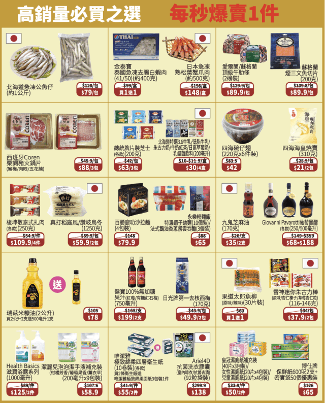 “日本價格同步專區”為精明消費者提供多款日式商品,價格媲美日本當地。包括有熊本熊白/啡蛋10只裝,特價$39.9/2盒(原價$38.9),營養豐富;卡樂B JAGABEE盒裝薯條特價$39.9/3件(原價$32),香脆可口,適合下午茶或派對分享。毋須遠赴日本,即可入手地道美食。