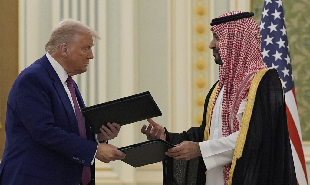 ▲美國總統特朗普13日在利雅得王宮的簽約儀式中,和沙特阿拉伯王儲沙爾曼(Mohammed Bin Salman)交換文件。美聯社