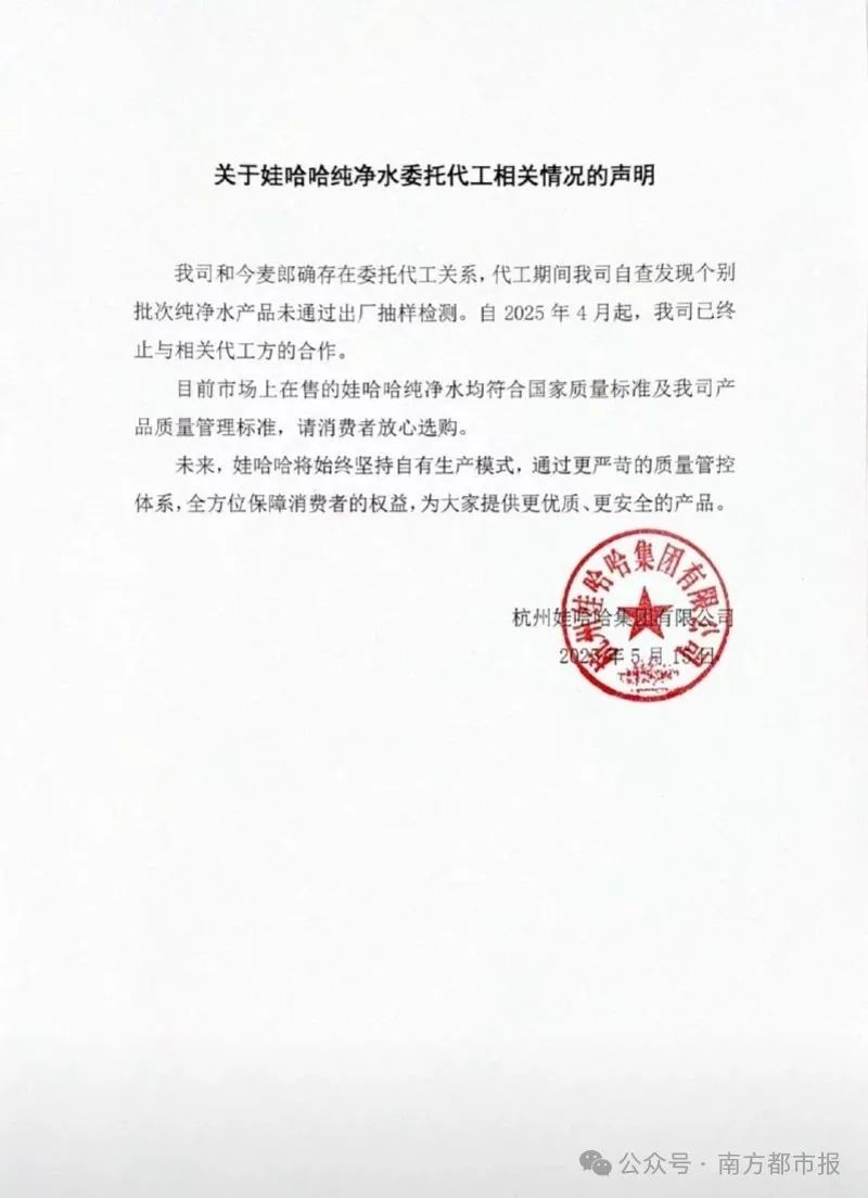 5月15日,娃哈哈官方發布《關于娃哈哈純凈水委托代工相關情況的聲明》,聲明寫道:“我司和今麥郎確存在委托代工關系,代工期間我司自查發現個別批次純凈水產品未通過出廠抽樣檢測。自2025年4月起,我司已終止與相關代工方的合作?!?/p>