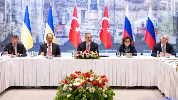 ▲俄羅斯(右)與烏克蘭(左)兩國代表團16日在土耳其伊斯坦布爾坐上談判桌,和談由地主土耳其主持。 (路透)