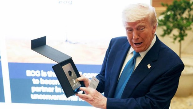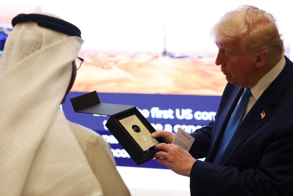 ▲當地時間5月16日,特朗普在阿聯酋展示他收到的來自該國的禮物——一滴石油。圖源:英媒