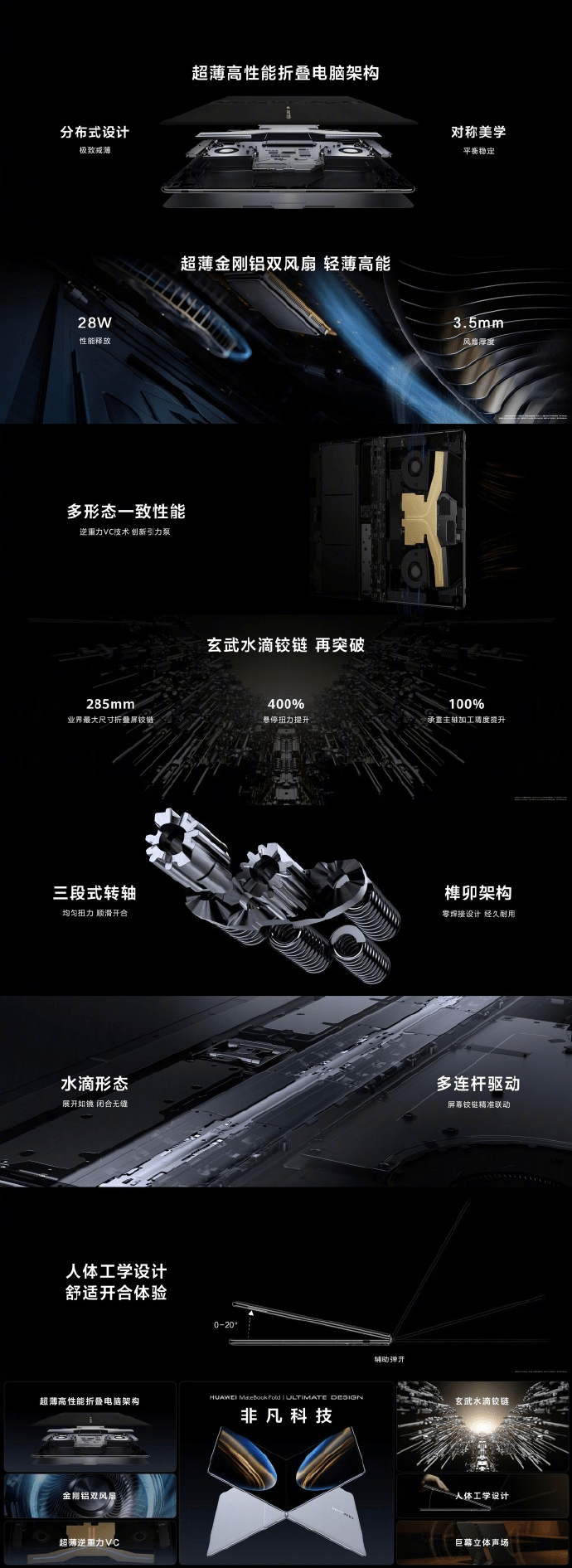 MateBook Fold非凡大師攻克了折疊屏設備在轉軸鉸鏈、超大屏幕、散熱效率、續航平衡上的難題。 據了解,華為 MateBook Fold 非凡大師采用超輕薄折疊設計,該產品折疊狀態僅有 13 英寸,展開后達到 18 英寸,最薄處僅只有 7.3 毫米,重量僅 1.16kg,既滿足輕薄便攜的同時,也給用戶帶來更沉浸的大屏體驗。