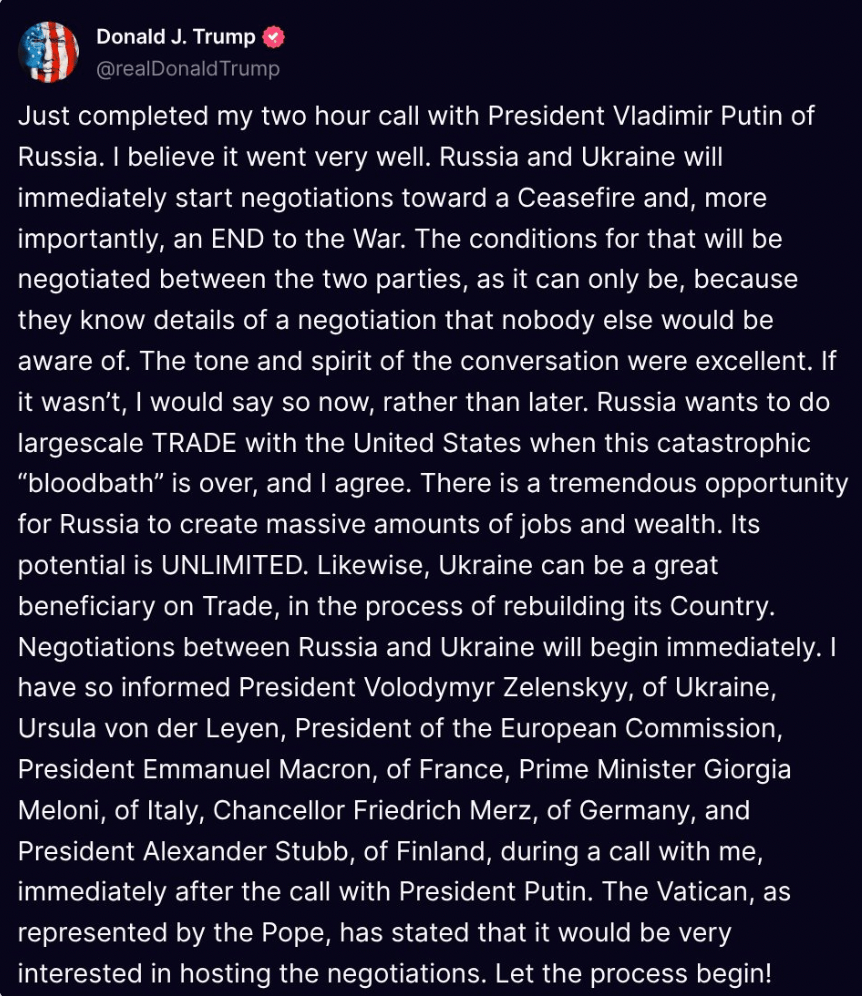 其后,特朗普在其社交平臺Truth Social發文表示,俄羅斯與烏克蘭同意立即啟動?;鹫勁?,他還稱,梵蒂岡方面已表明“非常有興趣”擔任和平談判的主持方,“讓談判進程開始吧”!