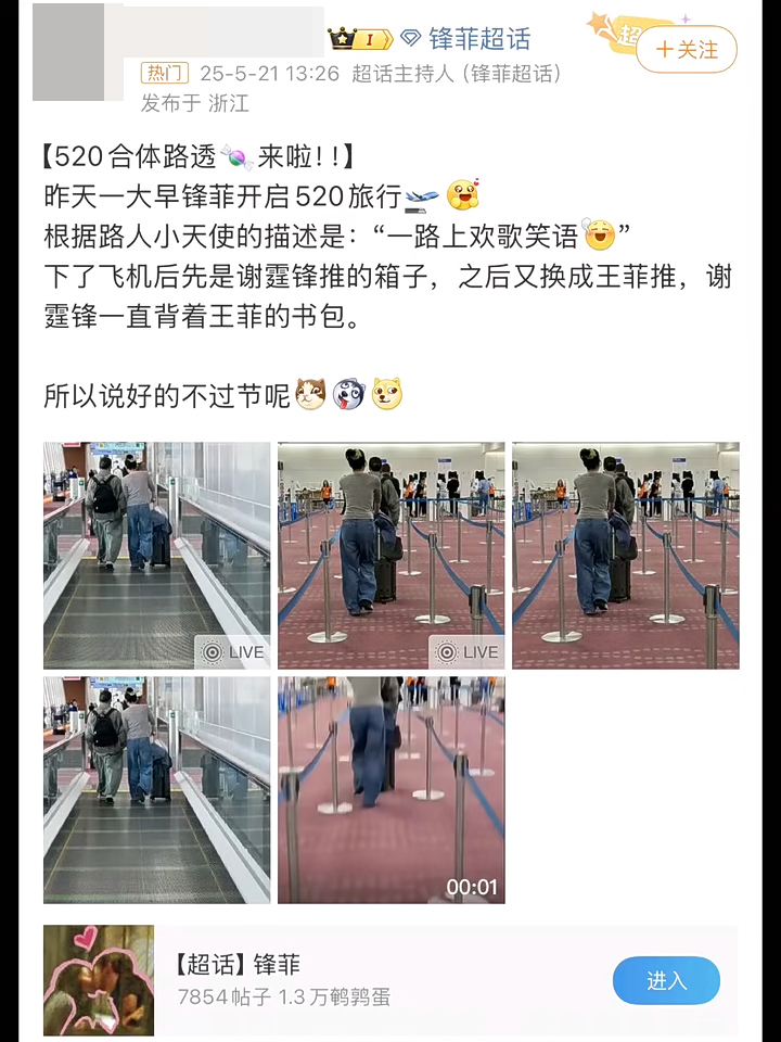 今日(21日)內地社交平臺流傳,被指是謝霆鋒與王菲被捕獲的照片,他們的粉絲轉發到微博超話,更引述拍到他們的網民表示:“跟據路人小天使的描述是‘一路上歡歌笑語’,下了飛機后先是謝霆鋒推的箱子,之后又換成王菲推?!备蟊x霆鋒一直背著王菲的背包,CP粉都大呼:“好甜!”同時又嘲曾表示不愛“過節”慶祝的二人竟選在“520”出游,說:“所以說好的不過節呢?”