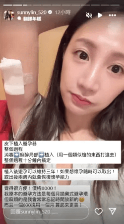 林采緹21日在IG限時動態留言問大家都用什么方法避孕?其后林采媞說:“但因為我自己也不愛另一半戴保險套的觸感!”她又指會忘記吃事前避孕藥,所以決定花1萬1千元臺幣植入避孕器。