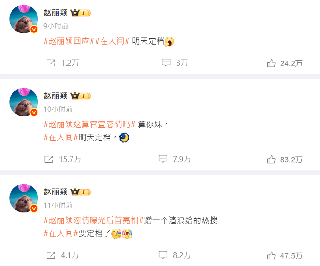 趙麗穎的發文公開后,因沒否認緋聞,而被外界猜測默認,熱搜榜上火速冒出“趙麗穎這算官宣戀情嗎”的關鍵字。趙麗穎看到后,再次轉發并回嗆:“算你妹?!对谌碎g》明天定檔?!币蜿P注度很高,“趙麗穎回應”也成為熱門關鍵字。趙麗穎三度轉發關鍵字,順勢再為《在人間》爭取曝光。
