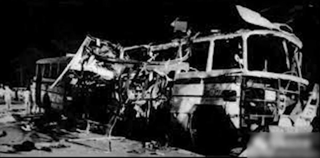 爆炸后現場慘不忍睹,巴士半車身破爛不堪,左側幾乎全部斷裂,7個單座椅架被炸飛,部份座墊遭炸到50多米外的屋頂,汽車碎片飛出80多米外。