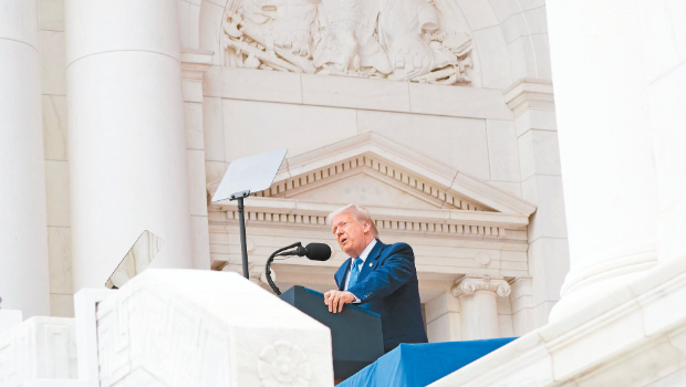 ▲特朗普在“國殤日”到阿靈頓國家公墓悼念陣亡軍人,并發表演說,鞭撻政敵,批評前朝政府管治不力。 美聯社