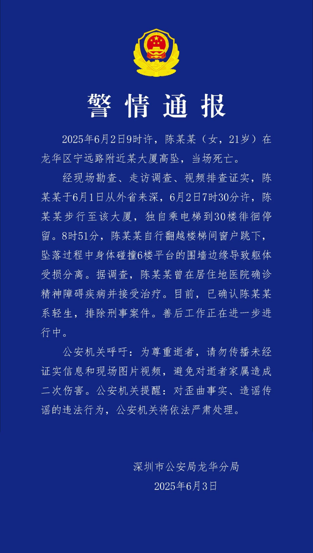 首頁>內地>社會 深圳龍華街頭驚現疑似“人頭”,官方通報:系輕生,排除刑案 發布時間:2025-06-03 18:27 網絡瘋傳多張疑是“人頭”被丟落街的照片,有網民指發生于深圳龍華區2日有疑是“人頭”物體被丟落街。網上消息指,死者因欠薪被殺,追薪者作案后跳樓身亡。深圳市公安局龍華分局年6月3日發布警情通報:6月2日9時許,陳某某(女,21歲)在龍華區寧遠路附近某大廈高墜,當場死亡。▲網傳行兇者砍脫欠薪者頭部后,跳樓身亡。X▲龍華有“人頭”被丟落街消息在網上引起熱議。抖音▲龍華有“人頭”被丟落街消息在網上引起熱議。 相關閱讀 教大地盤工人續追薪,爬離地50米高天秤抗議,消防到場戒備 香港社會2025-04-08 熱門文章 中美關稅|白宮稱特朗普與習近平或今周通話,中國外交部回應 央視記者追問南海爭議,菲防長竟然當面說記者是“特工” 韓國大選|尹錫悅、文在寅、樸槿惠、李明博,紛紛出動為各自陣營拉票 外媒指長和港口買家與市監局會面,同步制定B計劃,長和:頗多不盡不實之處 馬斯克被曝“捐精日本女歌手”,濱崎步親吐心聲 2日本人大連被殺,中國疑犯遭刑拘,警證生意糾紛引起 全球稀土真正戰場,外銀揭中國坐穩霸主關鍵:不是礦多就贏 馬斯克卸任公開承認與特朗普政府鬧分歧,不滿DOGE淪代罪羊 路透:美國加速關稅談判,擬促各國6月4日前提出最佳方案 繼英國后第2個達成關稅協議是“它”?特朗普:快談成了 專題 更多 > 中芯國際上半年營收預計超22億美元,四季度將試產7nm工藝 太興盈喜料多賺逾3倍,指將堅守審慎理財政策 中國移動半年多賺5%,中期息增近6% 清華女學霸創業、一年一融資,鎂佳股份估值9.3億美元沖刺港交所 應收賬款走高,豐沃股份三成收入打“白條” 惠科股份IPO:獲政府補助超53億,向實控人堂弟采購超8億 關稅戰|白宮:特朗普簽行政命令,對華關稅暫緩期再延長90日 高盛:64%關稅成本由美企“買單”,消費者僅承擔22% 美媒:特朗普政府通過關稅施壓,要求買美國軍火