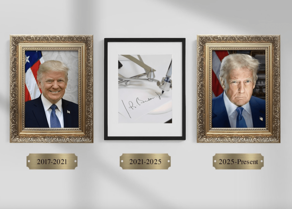 今年3月,特朗普曾在其社交平臺發布一張圖片,圖中包含其第一和第二任期的官方肖像照,中間放置一張拜登的自動簽名筆。FOX新聞網報道稱,特朗普此舉諷刺拜登使用自動簽名筆履職。