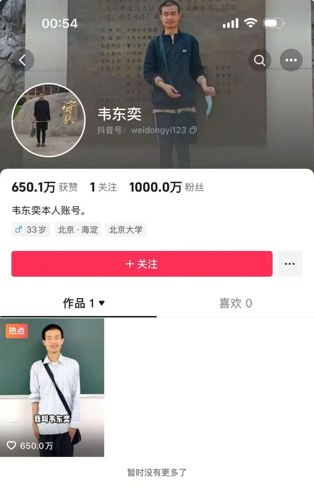 韋東奕的短視頻賬號周三(6月4日)晚發布首條視頻,時長僅4秒,他站在一塊黑板前說:“大家好,我叫韋東奕,這是我的個人賬號”。 該賬號周五(6日)引起網友關注,當晚11時許,粉絲數量已從當天早些時候的1萬暴漲至908萬,并且還在持續快速增長中。 至7日00:54分,韋東奕賬號粉絲數量突破1000萬。