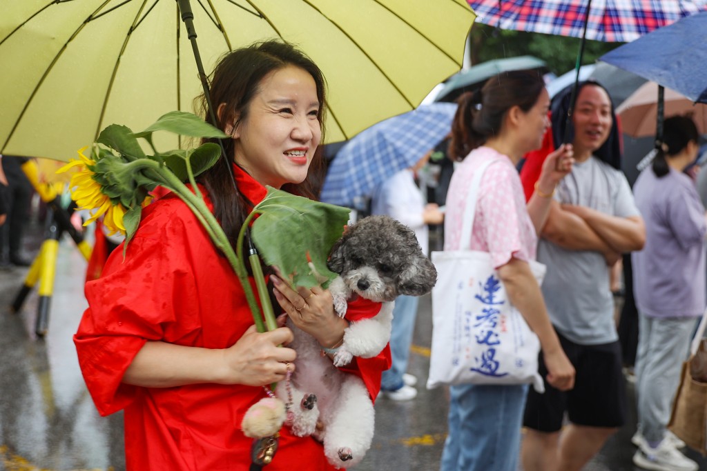 記者注意到,盡管9點開考后校門封閉,但仍有家長在雨中撐傘,等待孩子傳遞喜訊。