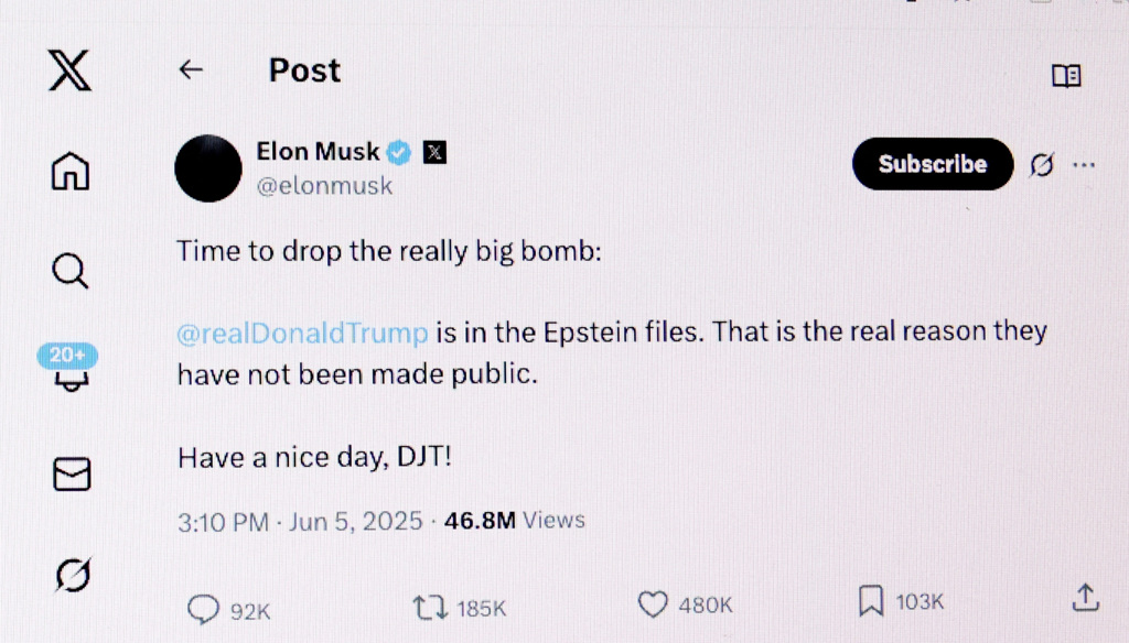 據《中時新聞網》綜合印度新德里電視臺、英國《每日電訊報》7日報導,馬斯克與特朗普這場“大而美的決裂”5日出現“愛潑斯坦”(Jeffrey Epstein)這個令各界大感意外的人名。馬斯克在名下的社群平臺X發文稱,“該是拋出真正重磅炸彈的時候了:特朗普名列愛潑斯坦檔案之中,這也是他們遲不公布調查內容的真正原因。祝DJT(特朗普姓名縮寫)有個美好的一天!”馬斯克還提醒眾粉絲要把這則重磅貼文標注起來,以因應日后“真相大白”時刻。特朗普政府一名官員稱馬斯克“情緒明顯失控”。這則貼文也讓特斯拉(Tesla)股價在跌勢之中繼續陡挫。
