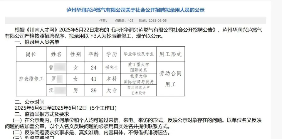網站工作人員確認,瀘州華潤興瀘燃氣有限公司擬錄用的三名抄表維修工分別為畢業于愛丁堡大學國際關系專業的曾某某、畢業于北京大學國際經濟與貿易專業的羅某、畢業于四川師范大學藝術設計專業的汪某某。