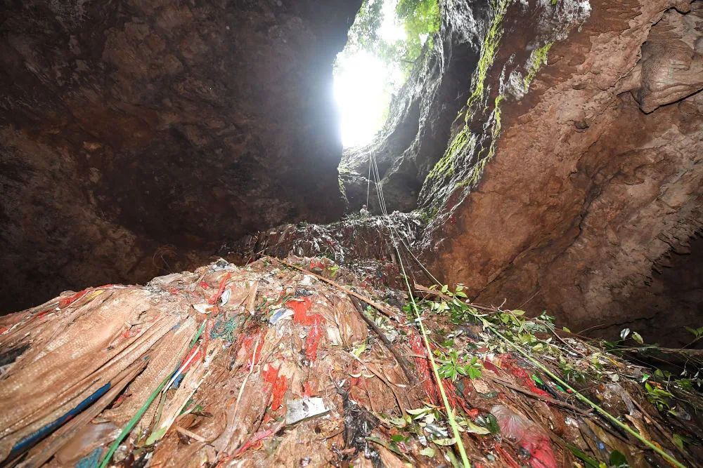 參與此地垃圾清運的某戶外運動公司負責人朱輝說,通過繩索與大型機械配合,每天能清運約10噸垃圾,但由于大田坑溶洞內部結構復雜,尚不清楚里面垃圾總量到底有多少。