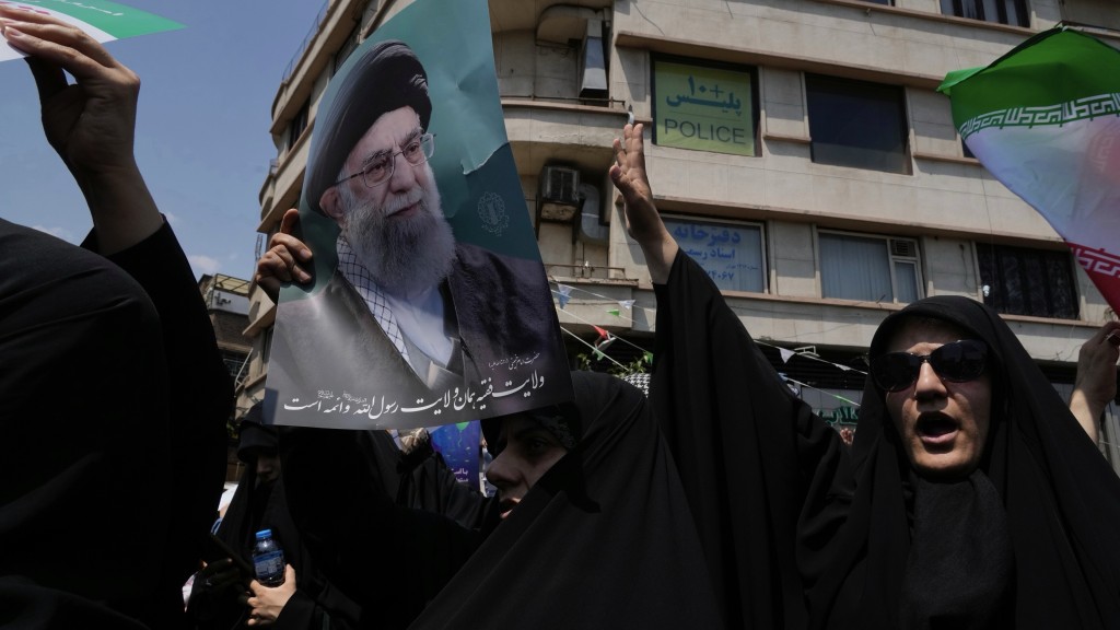 ▲伊朗示威者高舉最高領袖哈梅內伊的肖像。 美聯社