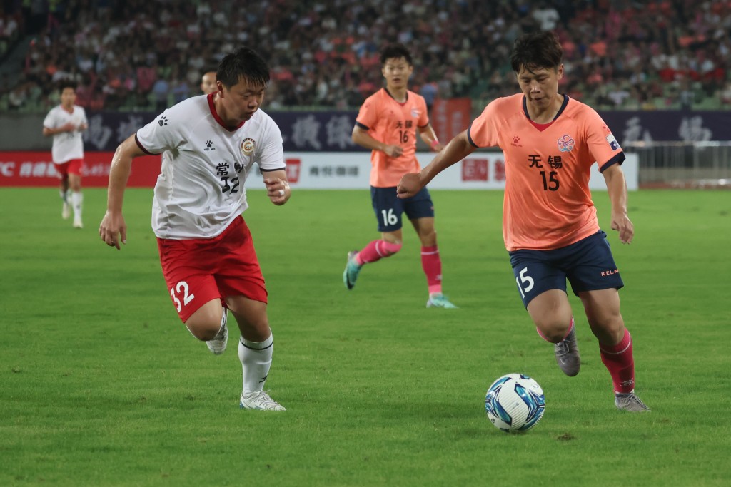 ▲江蘇省城市足球聯賽持續火爆,場內球員奮勇拼搏,看臺觀眾搖旗吶喊。中新社