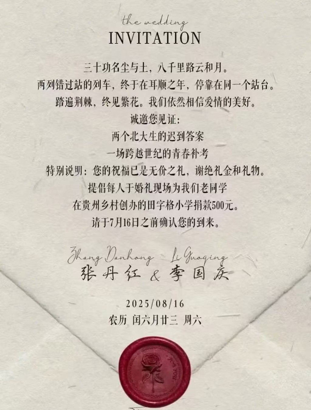 網傳結婚請柬寫道:“兩列錯過站的列車,終于在耳順之年,??吭谕粋€站臺。踏遍荊棘,終見繁花?!被槎Y謝絕禮金和禮物,提倡每人于婚禮現場向貴州田字格小學捐款500元。