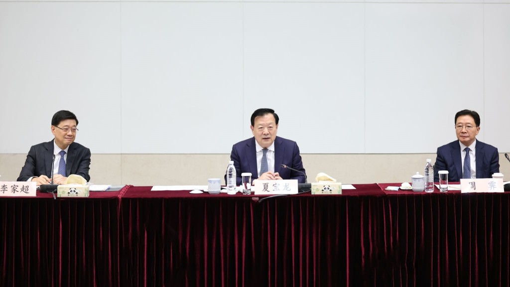 ▲夏寶龍昨日在政府總部與愛國愛港團體代表座談。旁為特首李家超和中聯辦主任周霽。