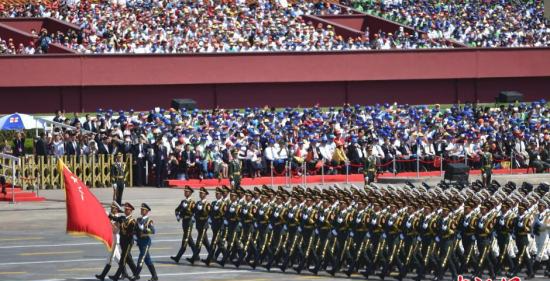空中護旗方隊飛離天安門上空后,由抗戰老兵、抗日英雄子女和抗戰支前模范代表組成的抗戰老同志方隊接受檢閱。