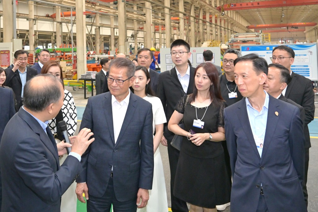 ▲財政司司長陳茂波(左二)帶同香港科技園公司的團隊到訪天津濱海高新技術產業開發區,并參訪開發區內一家從事先進設備制造業務的創新企業。