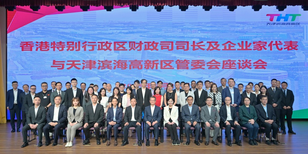 ▲財政司司長陳茂波(前排中)、香港科技園公司首席財務總監麥仕杰(前排左五)到訪天津濱海高新技術產業開發區,參與津港兩地的創新企業圓桌會議,并與出席人員合照。
