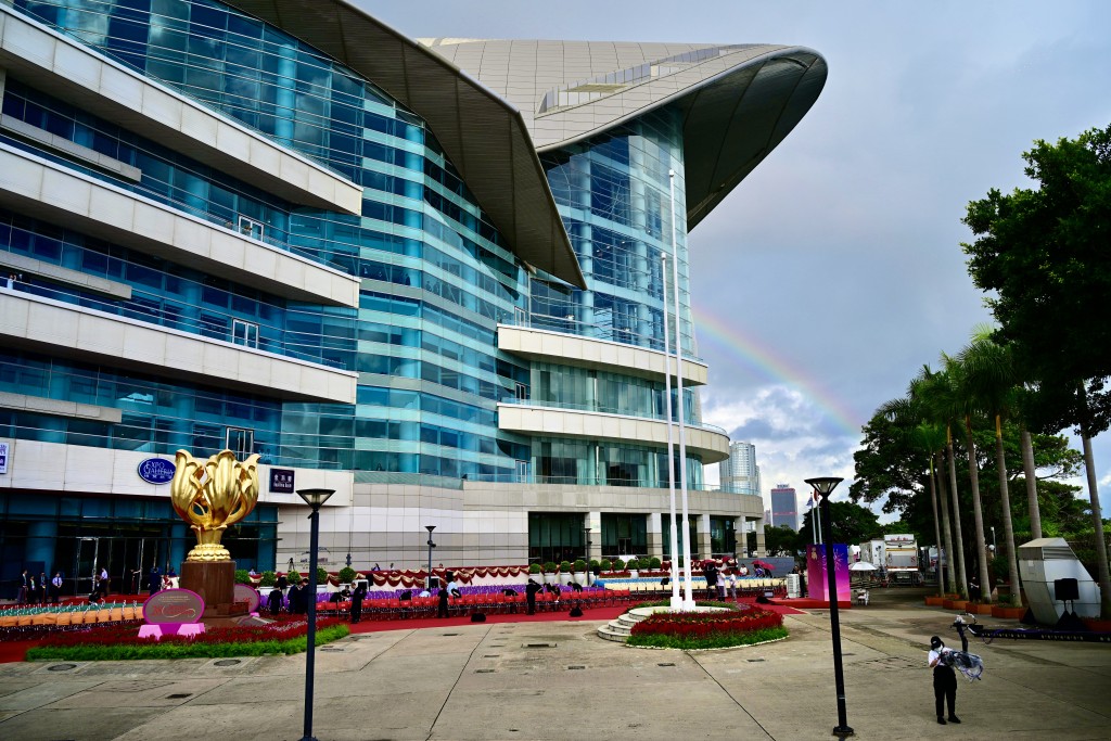 ▲昨晚天氣不穩下起大雨,但至今早已雨過天晴,今早金紫荊廣場上空出現彩虹。蘇正謙攝