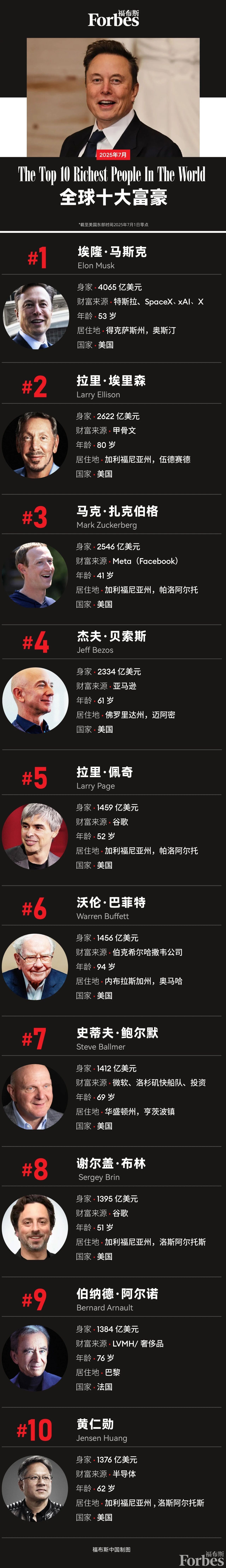 智通財經APP獲悉,福布斯中國7月3日發布7月全球十大富豪榜。過去一個月,納斯達克指數和標普500指數分別上漲近6%和5%,雙雙創下歷史新高,全球前十富豪財富整體上揚。全球首富埃隆·馬斯克成為6月最大“輸家”,身家縮水約160億美元,降至4070億美元。馬斯克6月大部分時間都在與其政府效率部(DOGE)前上司、美國總統唐納德·特朗普(Donald Trump)隔空互噴,導致其核心資產特斯拉(Tesla)股價下跌8%。