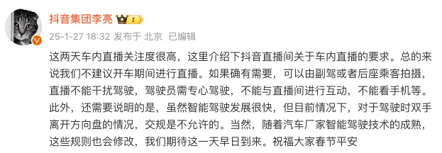 1月27日,抖音集團副總裁李亮發文表示:“如確有需要,可以由副駕或者后座乘客拍攝,直播不能干擾駕駛。駕駛員需專心駕駛,不能與直播間進行互動,不能看手機等?!?/p>