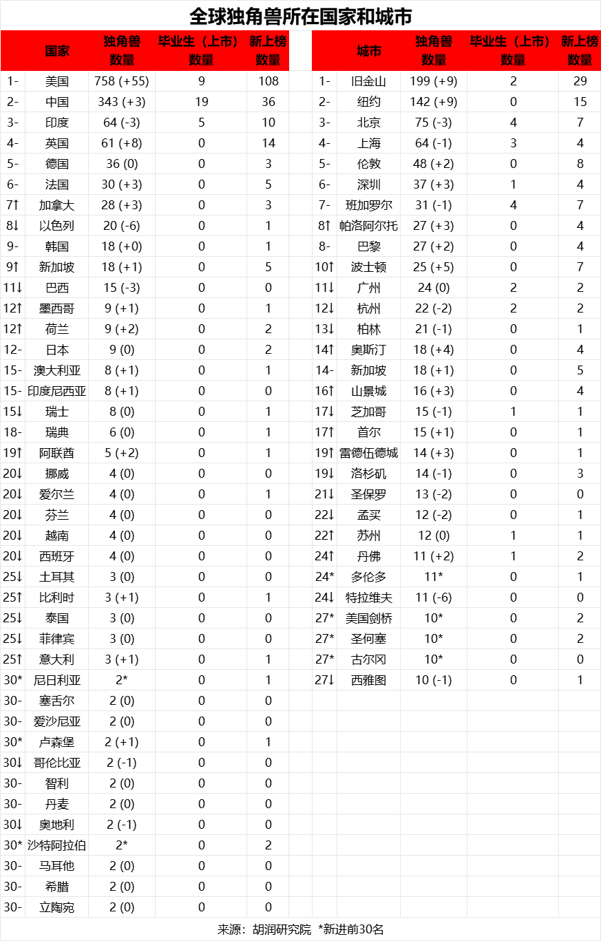 ▲全球獨角獸所在國家和城市,來源:胡潤研究所。