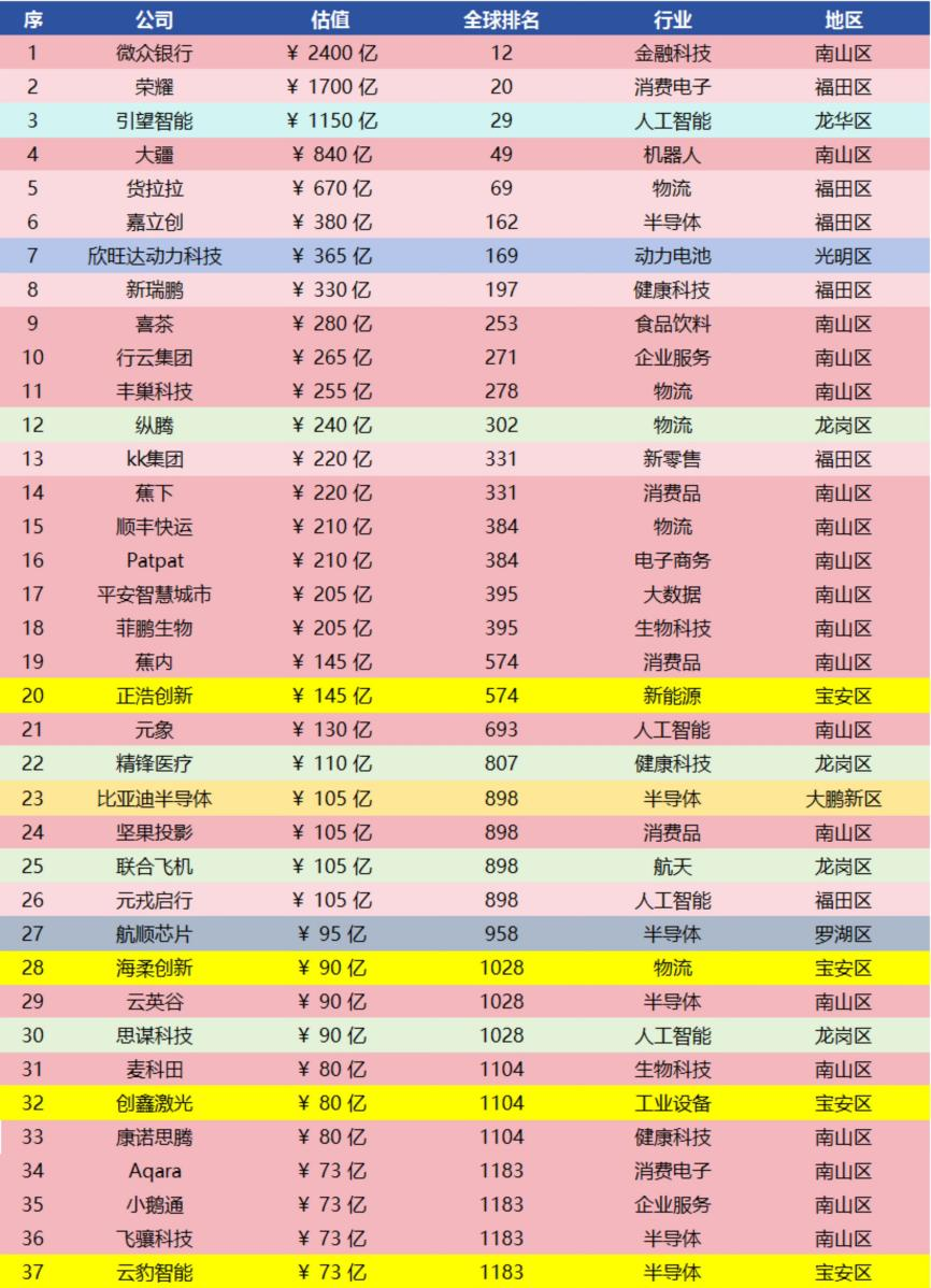 從價值來看,深圳37家入選企業價值合計1.1992萬億元人民幣,南山區19家入選企業價值合計5939億,福田區6家入選企業價值合計3405億,龍崗區4家入選企業價值合計545億,寶安區4家入選企業價值合計388億。